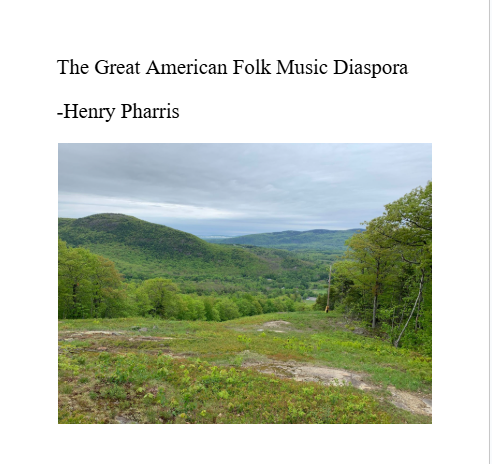 "The Great American Folk Music Diaspora" is an anthology written on the origins, development, and diversification of Appalachian Folk music. Though it bears no relation to my technical engineering skills, it does represent the fulfillment of requirements for my minor in music through an independent study. It was written over the period of a standard course and received an A+. It's structured as a collection of essays, each focused on an individual song or performance, illustrating the breadths and depths the genre has created and built over time.